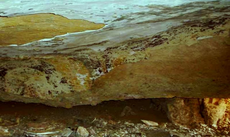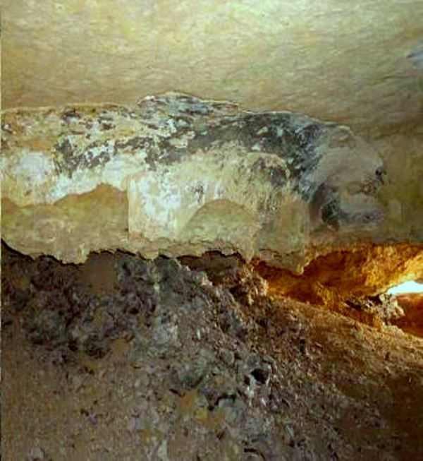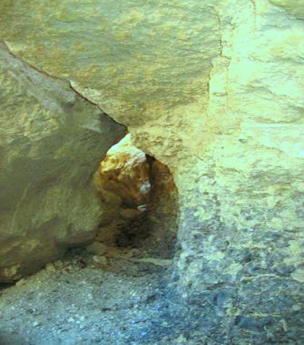 It is possible to get through the first small section from a crouched position, scraping between the fallen slabs. The crack opens out to the gap seen extreme centre left of the pic. above. Thereafter it is necessary to crawl completely flat, with back scraping the underside of the slab above.