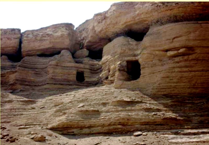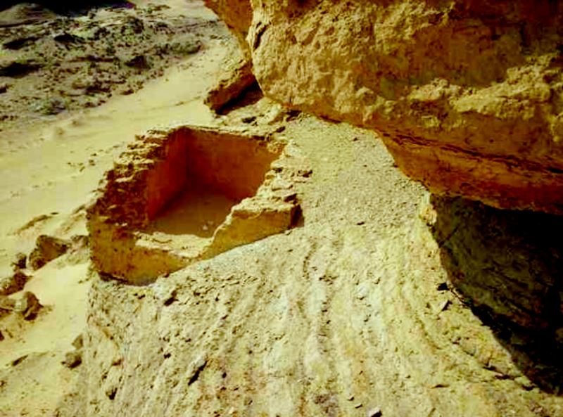 In general, the lookout positions give the widest possible view of the whole valley stretching to Lake Qarun over 8 miles away. Speculatively in a very ancient times the escarpment position would have been a perfect lookout home following glacial melt. The sea would have raised water to the doorstep of the mountain range. From inside and looking out, the view is spectacular. It is impossible to miss the feeling of tranquility while meditating there; though in its earliest days there must have been much tension as the Coptic brothers concealed themselves from the oppression of the occupying Roman soldiers. Down below in the valley, especially in the vicinity of el Saghr, the outline of very substantial fort foundations can be seen from beneath the sand of the desert.
